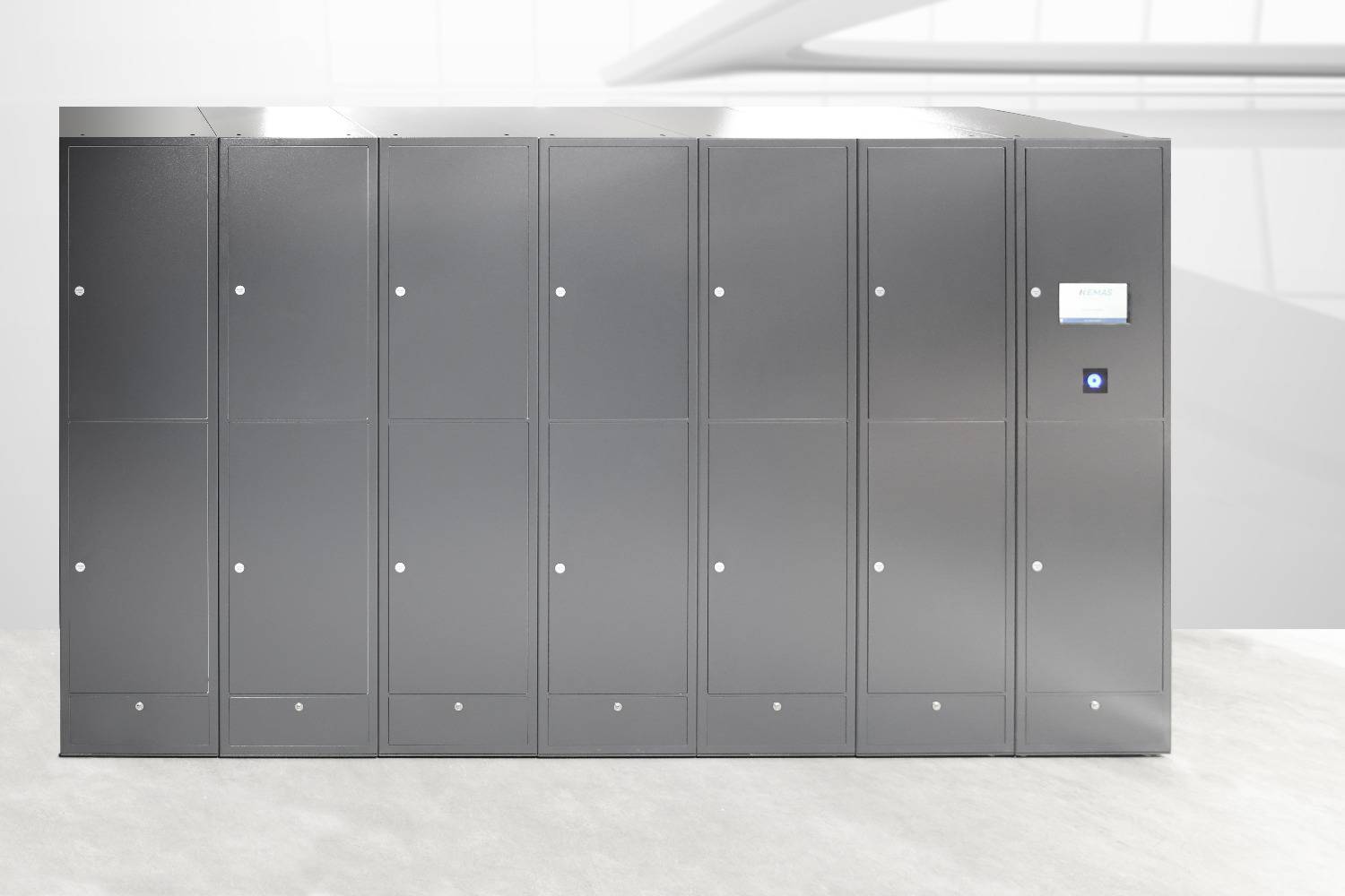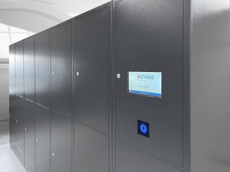 For the handover of workwear, a cabinet solution consisting of a service column and 8 modular columns was implemented at NEXIRA in France. In addition, 3 large laundry returns have been installed.